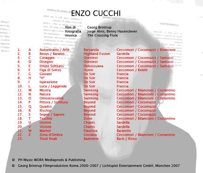 Die italienische Transavanguardiabewegung (Sandro Chia, Francesco Clemente, Enzo Cucchi, Nicola De Maria, Mimmo Paladino) bestand aus fünf italienischen Malern, die sich vom Ende der 70iger und in den gesamten 80igern international gesehen als die wichtigsten Vertreter der "postmodernen" Stilrichtung darstellten. Sie stellten die Neo-Avantgardebewegung in Frage und setzten sich mit den traditionellen Darstellungsmittel (Malerei, Skulpturen, darstellende oder lyrisch-abstrakte Zeichnung) auseinander. - Sieben Jahre lang habe ich Enzo Cucchi bei seinen Arbeiten, bei Ausstellungen usw. begleitet. Daraus entstand dieses kleine Portrait.
